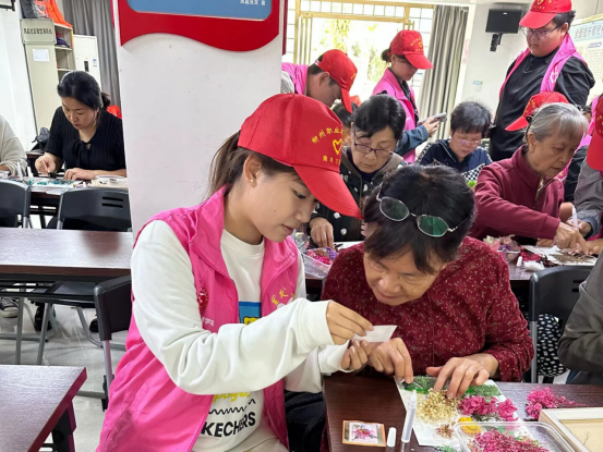 志愿者协助社区居民完成手工制品