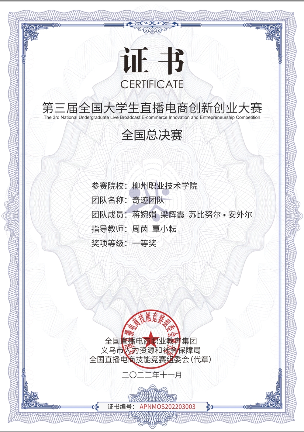 第三届全国大学生直播电商创新创业大赛全国总决赛一等奖